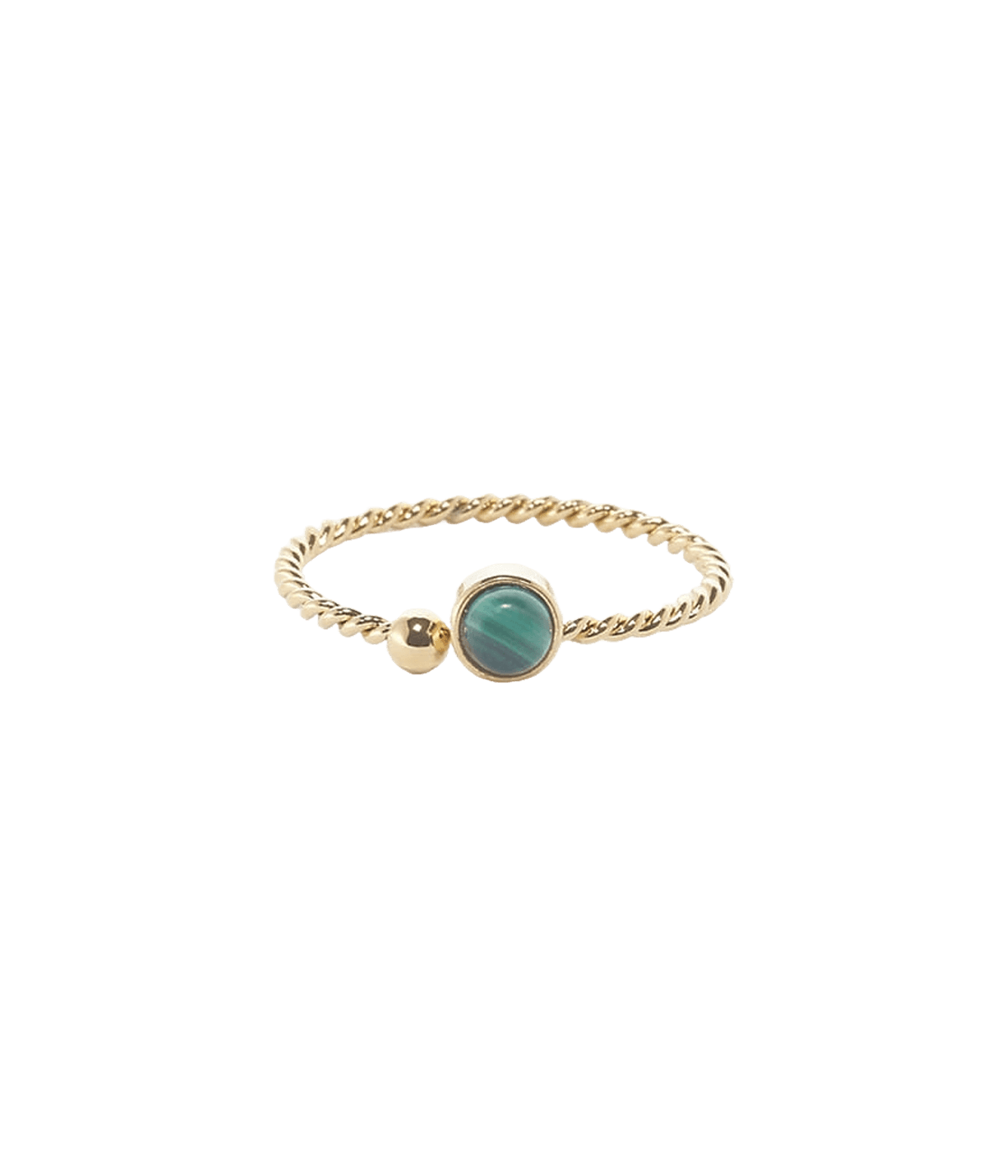 Spoutnik prilagodljiv prsten od pozlaćenog čelika, pletenog izgleda i ukrasom od prirodnog kamena. Može se nositi u kombinaciji s drugim prstenjem iz naše kolekcije.